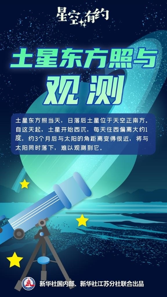 新華社南京11月21日電(記者王玨玢、邱冰清)11月23日17時47分迎來土星東方照,屆時土星將位于天空正南方。土星東方照后的一段時間,土星觀賞條件會逐漸變差,直至完全不可見。到下一次沖日前后,又迎來下一個土星觀賞的最佳時機。什么是土星東方照?它和土星沖日時看到的土星有什么區(qū)別?天文科普專家為您揭秘。
