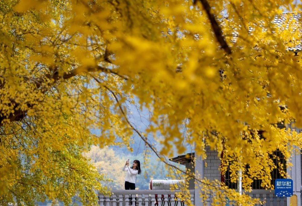 11月24日,游客在貴州省遵義市正安縣謝壩仡佬族苗族鄉(xiāng)上關村拍攝古銀杏樹。