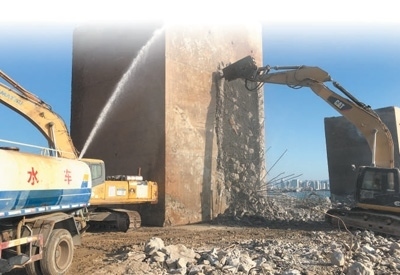 鳳凰島二期工程拆除施工期間,灑水車與挖掘機(jī)同步作業(yè),降塵抑塵。陳傳忠攝