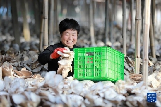12月6日,在邯鄲市肥鄉(xiāng)區(qū)毛演堡鎮(zhèn)路堡村,菇農在采摘菌菇。