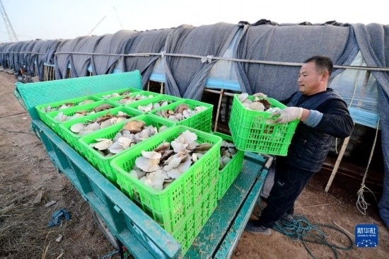 12月6日,在邯鄲市肥鄉(xiāng)區(qū)毛演堡鎮(zhèn)路堡村,菇農在搬運菌菇。
