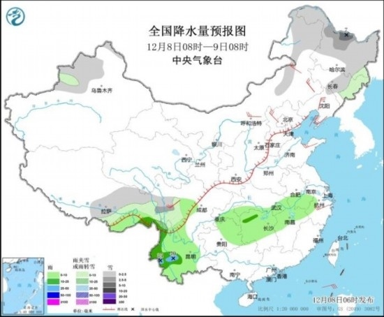 12月8日08時(shí)至9日08時(shí),內(nèi)蒙古東北部、黑龍江、吉林中東部、遼寧北部、新疆北疆、西藏東部、川西高原西部等地部分地區(qū)有小到中雪或雨夾雪,其中,黑龍江北部局地有大雪(5~7毫米)。西藏南部、四川中西部、云南大部、重慶東南部、貴州東部和北部、湖南中北部、江西北部、湖北南部、安徽南部、浙江西部等地部分地區(qū)有小到中雨,其中云南西部局地有大雨(25~40毫米)。內(nèi)蒙古中東部、河北北部、遼東半島、山東半島、浙江東部等地部分地區(qū)有4~6級(jí)風(fēng)。
