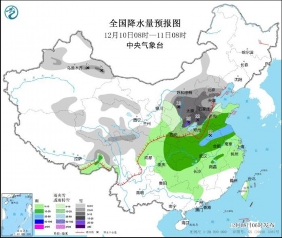 12月10日08時(shí)至11日08時(shí),新疆沿天山地區(qū)和伊犁河谷、內(nèi)蒙古河套地區(qū)、西藏北部和東部、川西高原北部、西北地區(qū)中部和東北部、華北、黃淮北部等地部分地區(qū)有小到中雪或雨夾雪,其中,新疆沿天山地區(qū)、陜西北部、山西中南部、河北中南部、北京西南部、天津南部、山東西北部、河南北部等地部分地區(qū)有大到暴雪或雨夾雪,局地大暴雪(20~22毫米)。西北地區(qū)東南部、黃淮中南部、江淮、江漢、江南大部、西南地區(qū)東部、華南北部、臺(tái)灣島等地部分地區(qū)有小到中雨,其中,河南南部和西部、安徽北部、江蘇北部、湖北北部等地部分地區(qū)有大雨(25~35毫米)。黑龍江東北部部分地區(qū)有4~6級(jí)風(fēng)。