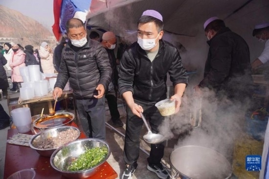 12月19日,在甘肅臨夏積石山縣大河家鎮(zhèn)大河村安置點,蘭州餐飲企業(yè)“筷上癮”為受災群眾送來愛心牛肉面。