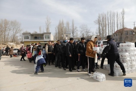 12月19日,在甘肅臨夏積石山縣大河家鎮(zhèn)大河村安置點,受災群眾領取礦泉水。