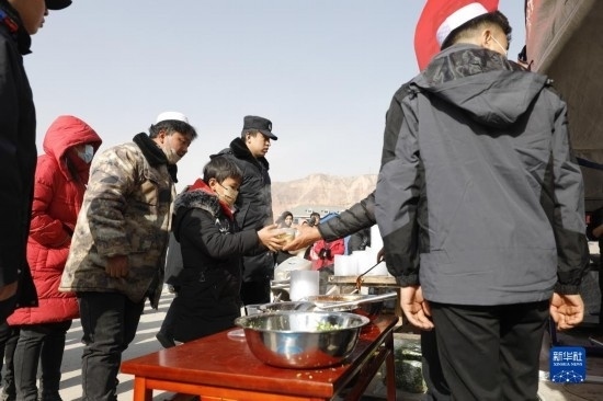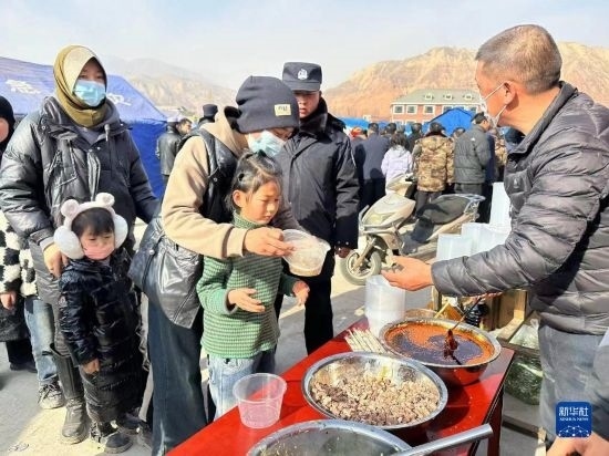 12月19日,在甘肅臨夏積石山縣大河家鎮(zhèn)大河村安置點,受災群眾領取愛心牛肉面。
