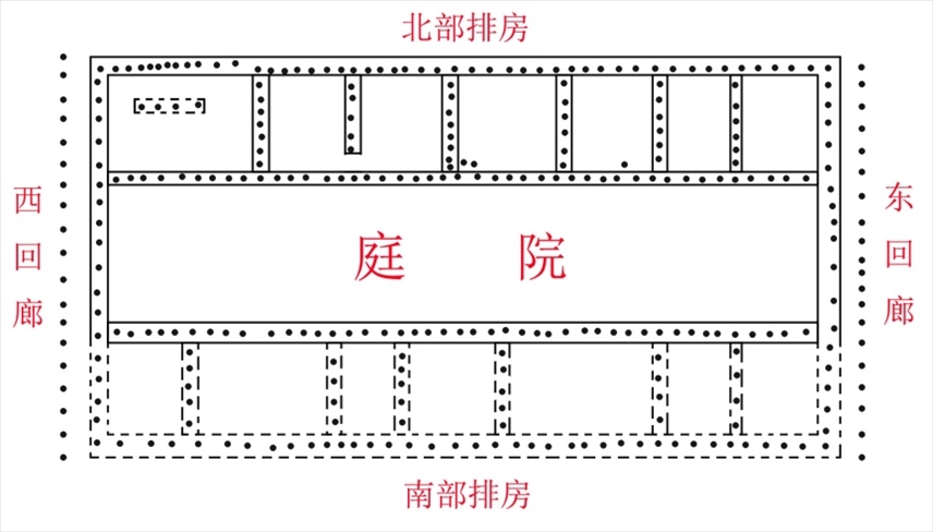 “從柱洞的分布規(guī)律來看,這一夯土臺基整體應(yīng)是南北為排房建筑、中部為庭院、東西帶回廊的結(jié)構(gòu),規(guī)模宏大,結(jié)構(gòu)復(fù)雜?!惫懦钦z址發(fā)掘現(xiàn)場負責(zé)人李博說。