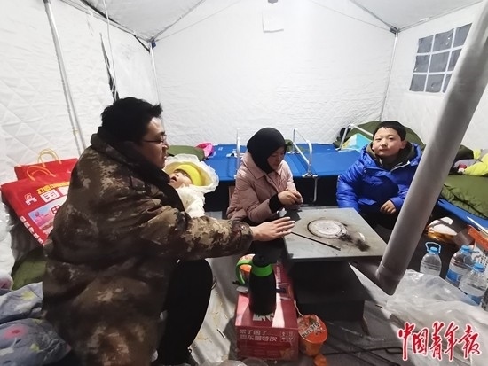幸運(yùn)的是,李琴?zèng)]有受傷,但家卻回不去了。她只能和村里的多數(shù)人一樣,在玉米地里“湊合了一晚”。第二天,村里發(fā)來帳篷,還有一箱方便面和火腿腸。物資有限,李琴和親戚兩家9個(gè)人擠一頂帳篷,裹上最厚的棉衣,生了火,但還是冷得發(fā)抖。一到晚上,帳篷內(nèi)壁全掛著冰碴兒,“只能說勉強(qiáng)受得住”。