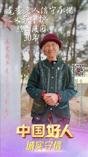 趙銀亭,女,1929年10月生,中共黨員,山東省濱州市惠民縣石廟鎮(zhèn)歸化村村民。趙銀亭是一位有75年黨齡的老黨員。1992年,當(dāng)?shù)亟⒘沂苛陥@,需要一位守陵人,63歲的趙銀亭主動報(bào)了名。自此,她與丈夫搬到了距烈士陵園不過15米的舊屋居住。30多年來,她堅(jiān)守信仰,守護(hù)烈士陵園,為前來參觀的人員講述英烈故事。