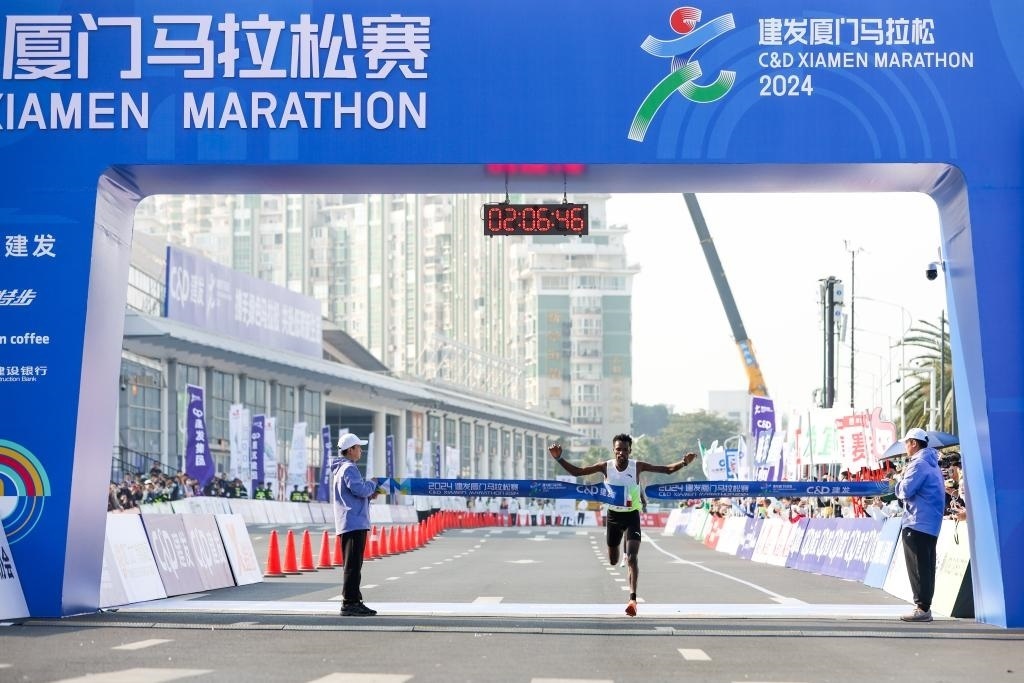 1月7日,埃塞俄比亞選手凱碧貝在廈馬比賽中沖過終點(diǎn)線。新華社發(fā)(廈門馬拉松賽事組委會(huì)供圖)
