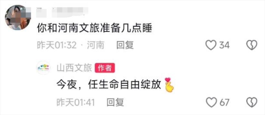 有網(wǎng)友稱“河南文旅按小時(shí)發(fā),咱們山西按分鐘發(fā)”,“山西文旅你勤快得讓我有點(diǎn)陌生”,凌晨,山西文旅小編仍在與網(wǎng)友互動——