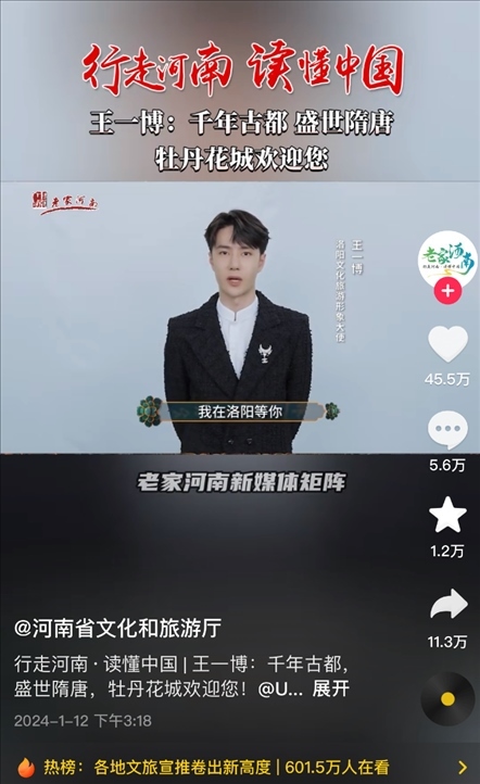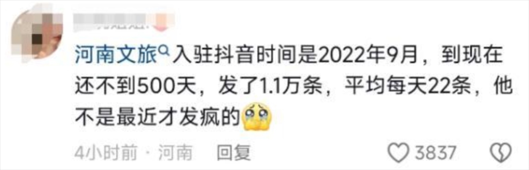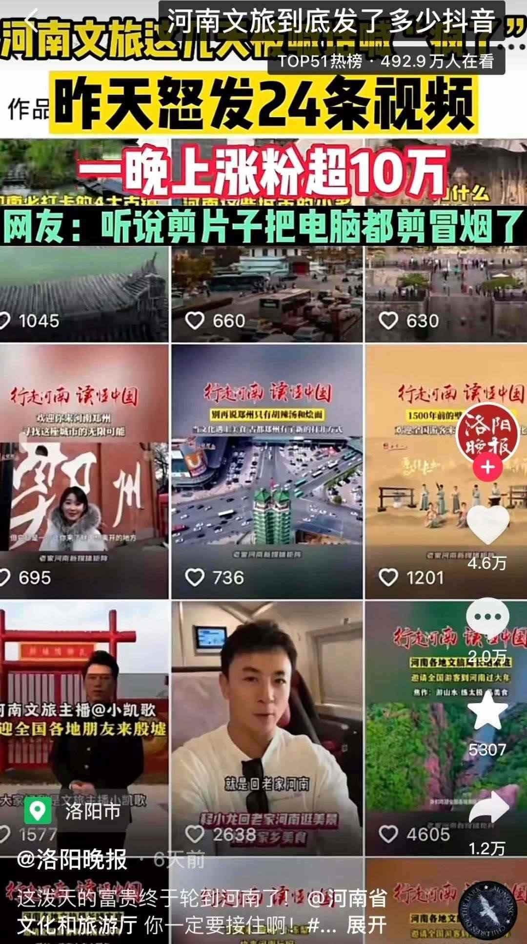 有人統(tǒng)計(jì),自1月9日起,河南文旅官方賬號“河南省文化和旅游廳”每天發(fā)布二三十條視頻,連續(xù)四天發(fā)布了112條視頻,持續(xù)展示本地文旅資源,吸引了近百萬新粉絲,主打一個(gè)“量變總會引起質(zhì)變”,以至于“河南文旅到底發(fā)了多少抖音”相關(guān)話題成為熱門搜索。