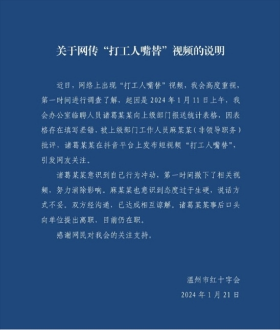 ·溫州市紅十字會回應(yīng)網(wǎng)傳“打工人嘴替”視頻:表格填錯被批評引發(fā),雙方認(rèn)識到自己不足已諒解。