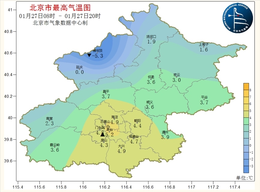 南郊觀象臺從1月29日到2月6日最高氣溫0~4℃,最低氣溫-8~-4℃。