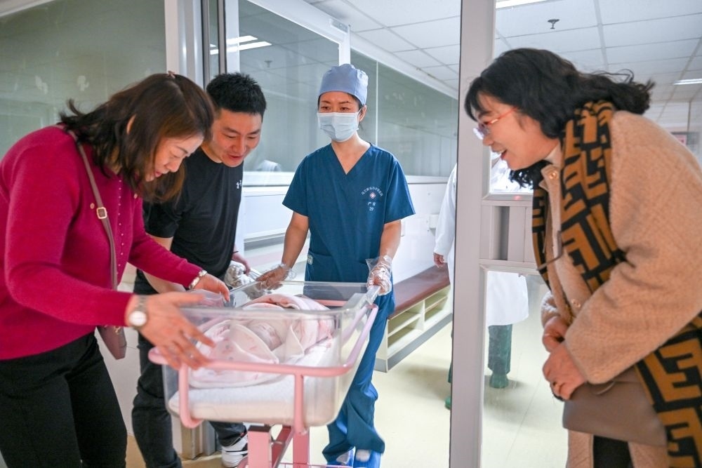 2月10日,在廣東省鶴山市人民醫(yī)院,一名剛出生的“龍寶寶”和家人在一起。新華社發(fā)(黃繼明 攝)