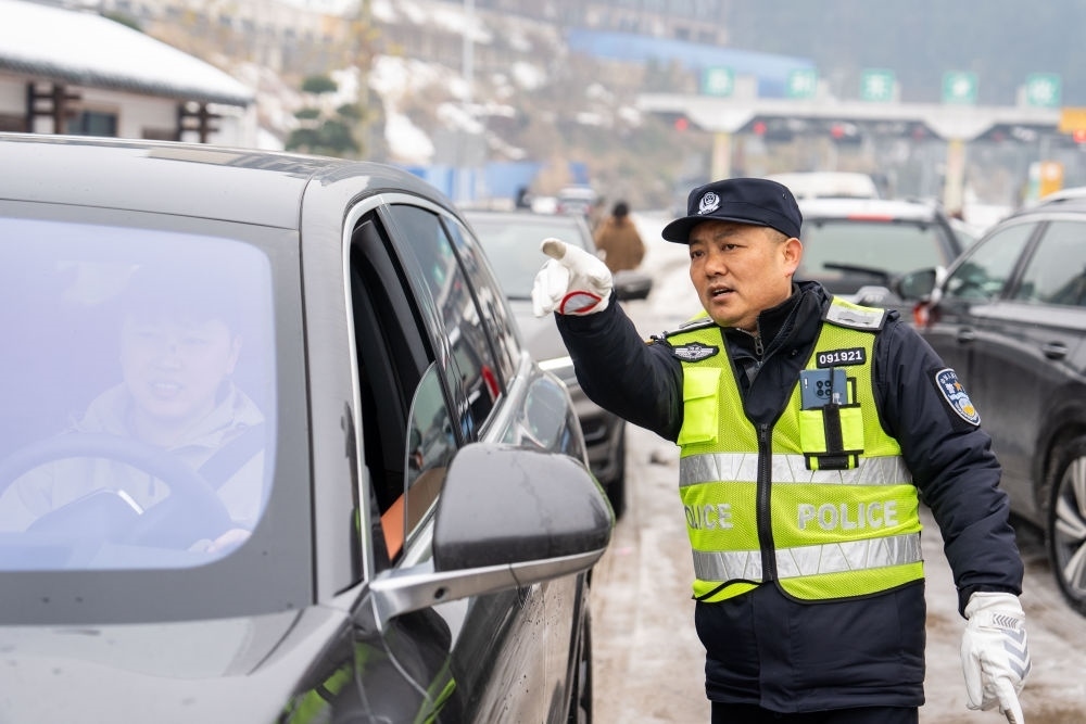 在湖南長張高速慈利東收費站附近,交警解答旅客的提問(2月6日攝)。新華社記者 陳思汗 攝