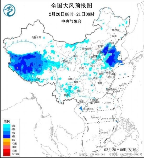 預(yù)計(jì),2月20日8時(shí)至21日8時(shí),西藏中西部、青海中南部、內(nèi)蒙古中西部、遼寧南部、華北東南部、黃淮西部和東部、江淮西部和北部等地的部分地區(qū)有5~7級(jí)風(fēng),陣風(fēng)8~9級(jí)。渤海、渤海海峽、黃海大部海域?qū)⒂?~8級(jí),陣風(fēng)9~10級(jí)的大風(fēng)。
