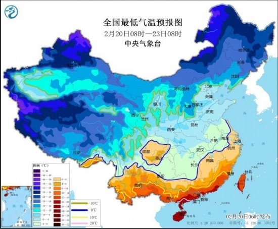 中新網(wǎng)2月20日電 據(jù)中央氣象臺(tái)網(wǎng)站消息,中央氣象臺(tái)2月20日6時(shí)繼續(xù)發(fā)布寒潮橙色預(yù)警:受寒潮影響,預(yù)計(jì),2月20日至2月23日,我國(guó)中東部大部將自北向南先后出現(xiàn)降溫,日平均或最低氣溫普遍下降8~12℃,華北南部、黃淮西部、江淮、江漢、江南、華南中北部及貴州等地氣溫將下降12~18℃,其中,湖南南部、貴州東部、廣西北部等地的部分地區(qū)累計(jì)降溫幅度可達(dá)20℃以上。2月23日前后,最低溫度0℃線將南壓到蘇皖南部至湖南南部、貴州南部一帶。