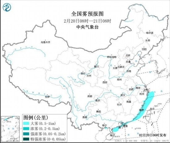 中央氣象臺(tái)2月20日6時(shí)繼續(xù)發(fā)布大霧黃色預(yù)警: