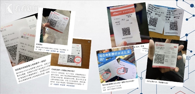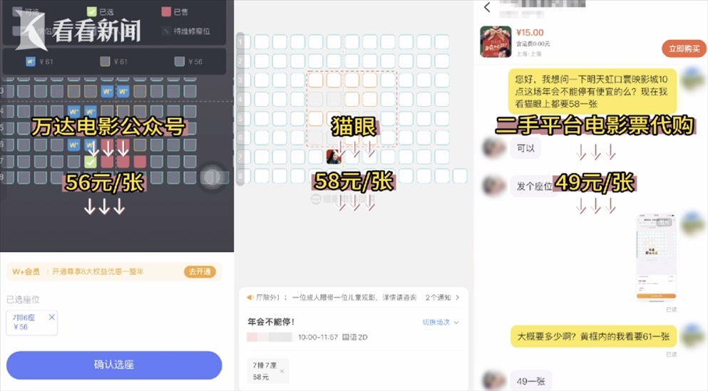 為了求證這一說(shuō)法,記者來(lái)到了網(wǎng)友爆料的這家電影院,并提前通過(guò)三種渠道在線上購(gòu)入了同天、同電影院、同場(chǎng)次、同排位置的三張電影票,分別花費(fèi)了56元、58元、49元。