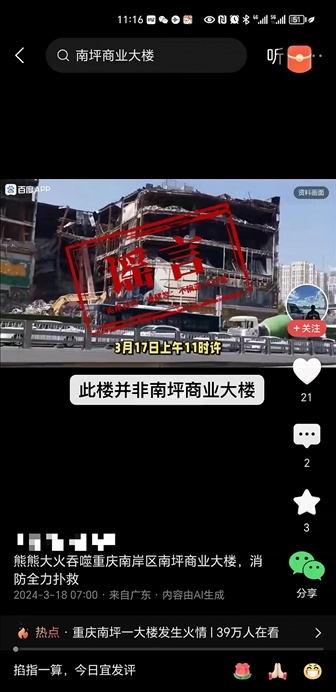 央視網(wǎng)消息:據(jù)“網(wǎng)信南岸”微信公眾號(hào)消息,3月18日,網(wǎng)傳消息稱“重慶南坪商業(yè)大樓突發(fā)大火,傷亡慘重”,有網(wǎng)友還發(fā)布了經(jīng)AI生成且圖文嚴(yán)重不符的視頻。經(jīng)核實(shí),17日11時(shí)16分,南坪商業(yè)大廈住宅著火,區(qū)消防救援支隊(duì)和南坪街道及時(shí)到場(chǎng)處置,11時(shí)35分,現(xiàn)場(chǎng)明火熄滅,無(wú)人員傷亡,未發(fā)生次生事故。南岸辟謠提醒您,不造謠、不信謠、不傳謠!