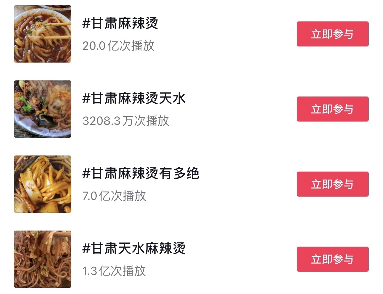 “這兩條視頻吸引了大量網(wǎng)民觀看、點(diǎn)贊、轉(zhuǎn)發(fā),之后陸續(xù)有網(wǎng)民發(fā)布相關(guān)視頻。”3月18日,甘肅省文化和旅游廳在回復(fù)網(wǎng)友建議中提到,3月份以來,“甘肅麻辣燙”話題迅速發(fā)酵,視頻內(nèi)容迅速增加,多次登上抖音、快手等短視頻平臺(tái)熱榜。截至3月16日18:00,各大短視頻平臺(tái)上“甘肅麻辣燙”相關(guān)話題累計(jì)播放量已超過32.6億次。