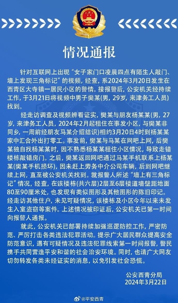 央視網(wǎng)消息:據(jù)平安西青微信公眾號(hào)消息,針對(duì)互聯(lián)網(wǎng)上出現(xiàn)“女子家門口凌晨四點(diǎn)有陌生人敲門墻上發(fā)現(xiàn)三角標(biāo)記”的視頻,經(jīng)查,系2024年3月20日發(fā)生在西青區(qū)大寺鎮(zhèn)一居民小區(qū)的警情。接報(bào)警后,公安機(jī)關(guān)經(jīng)持續(xù)工作,于3月21日將視頻中男子樊某(男,29歲,來津務(wù)工人員)找到。