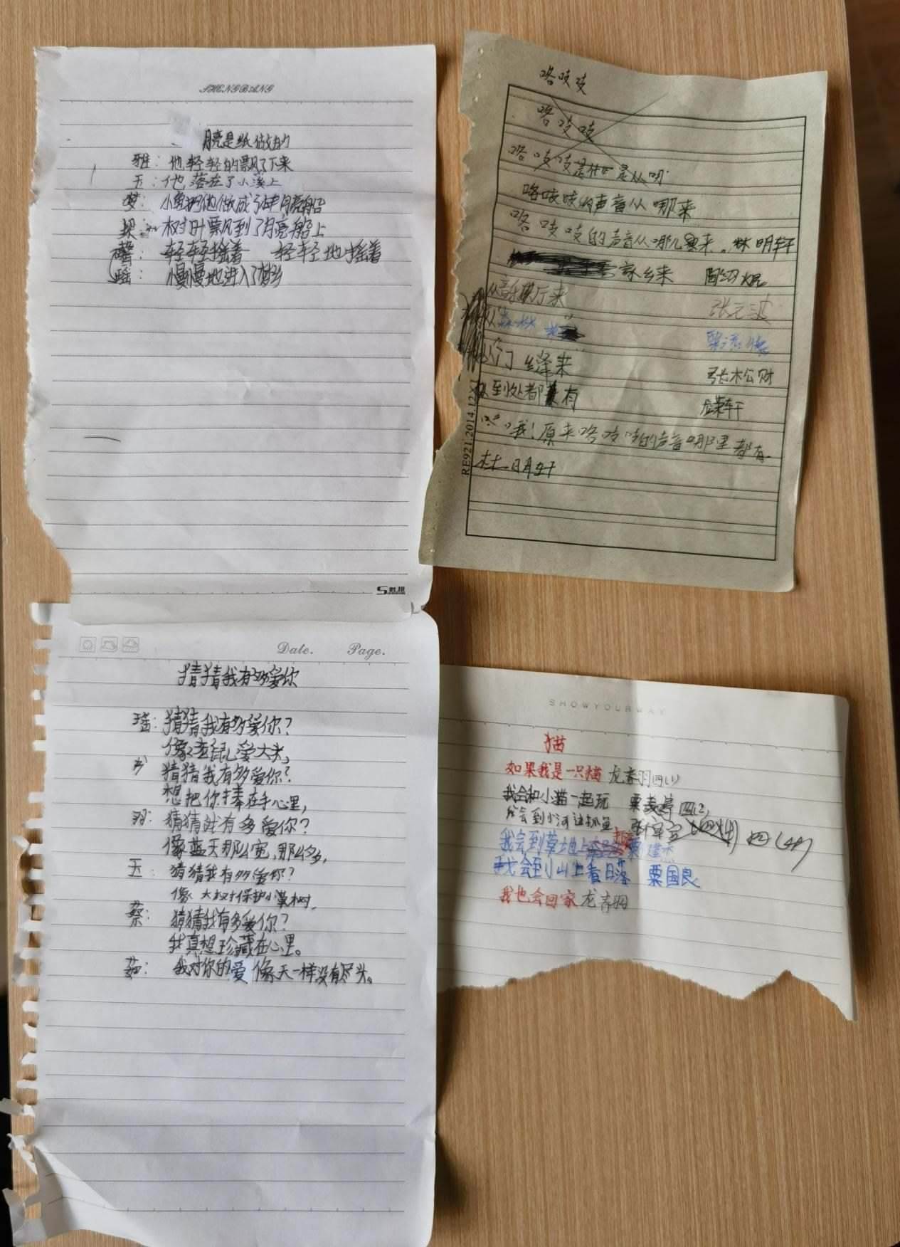 11歲的龍夢瑤是詩班里高產(chǎn)的一個。她在本子上擠擠挨挨寫一團字,一把撕下整頁,塞給李柏霖。這樣的紙片,李柏霖一天要收到幾十張。大大小小夾在書里,她晚上批改完,第二天再拿回學(xué)校,在課堂上分享。她估計,孩子們寫的詩已經(jīng)超過2000首。