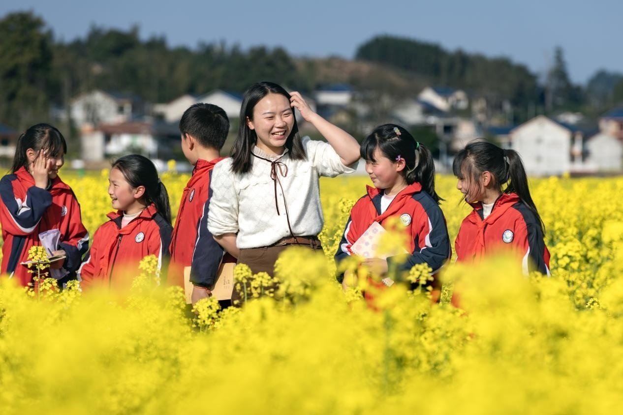李柏霖不愿意讓孩子們覺得這樣的情緒是生活的全部。她把課堂搬到野外,在“搖搖花”開的時候帶孩子們?nèi)タ础皳u搖花”,油菜花開時去看油菜花?;ㄒ彩窃?,家鄉(xiāng)也是詩——若非如此,老師為什么走了又回呢?