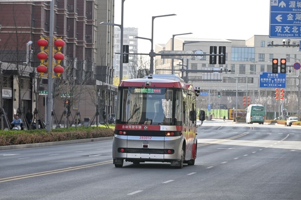 ↑3月29日,智能網(wǎng)聯(lián)巴士在雄安新區(qū)容東片區(qū)道路上行駛。