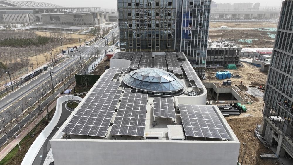 ↑雄安自貿(mào)試驗(yàn)區(qū)交流展示中心是首批通過(guò)新區(qū)專家評(píng)審的零碳示范建筑,這是該中心屋頂?shù)墓夥l(fā)電設(shè)施(3月28日攝,無(wú)人機(jī)照片)。