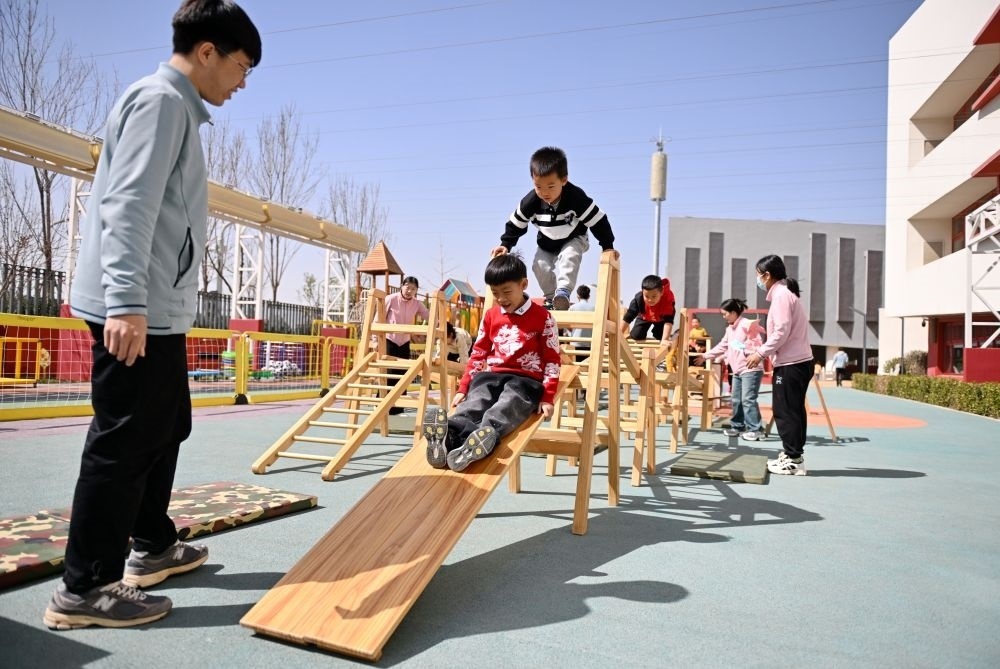 ↑3月29日,雄安北海幼兒園的孩子們?cè)谑彝庾鲇螒颉?/p>