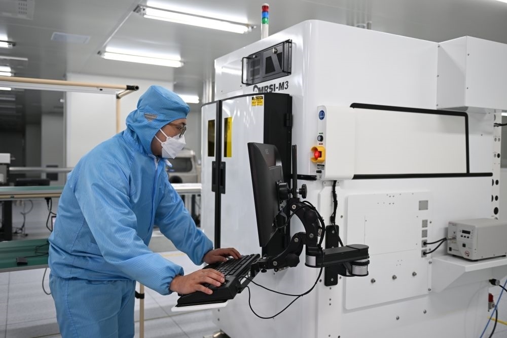 ↑3月28日,在雄安科創(chuàng)中心中試基地,芯聯(lián)新(河北雄安)科技有限公司工作人員在調(diào)試芯片生產(chǎn)設(shè)備。