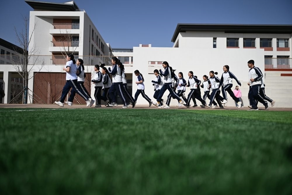↑3月29日,北京四中雄安校區(qū)的學(xué)生在操場(chǎng)上跑步。