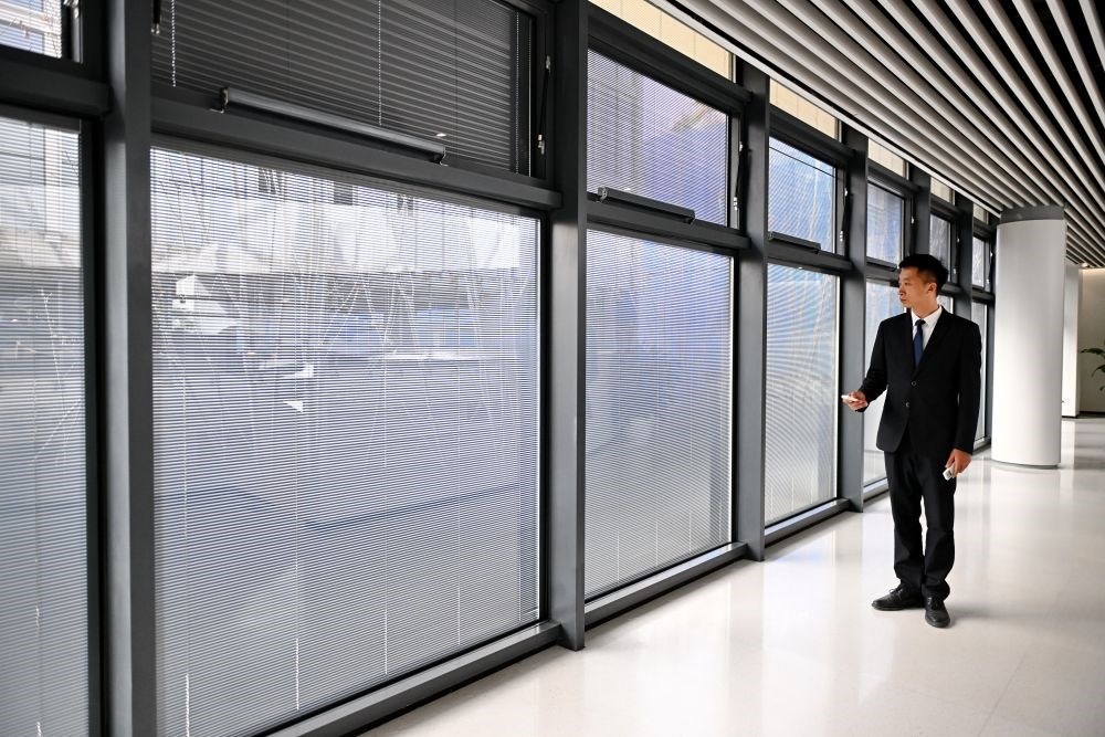 ↑3月28日,雄安自貿(mào)試驗(yàn)區(qū)交流展示中心的工作人員在展示兼具保溫與遮陽(yáng)效果的鍍膜玻璃,該中心是首批通過(guò)新區(qū)專家評(píng)審的零碳示范建筑。