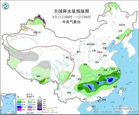 4月11日08時至12日08時,新疆北疆北部、內(nèi)蒙古東北部、黑龍江西北部、西藏西部和中北部、青海南部、川西高原等地部分地區(qū)有小到中雪或雨夾雪,其中,新疆北疆北部高海拔地區(qū)有大到暴雪,局地大暴雪(20~25毫米)。貴州東部、廣西北部、江南大部的部分地區(qū)有中到大雨,其中,湖南東部和西南部、廣西北部、江西東北部、浙江西南部、福建西北部等地部分地區(qū)有暴雨或大暴雨(100~120毫米)。內(nèi)蒙古西北部、西藏西部等地部分地區(qū)有4~5級風。