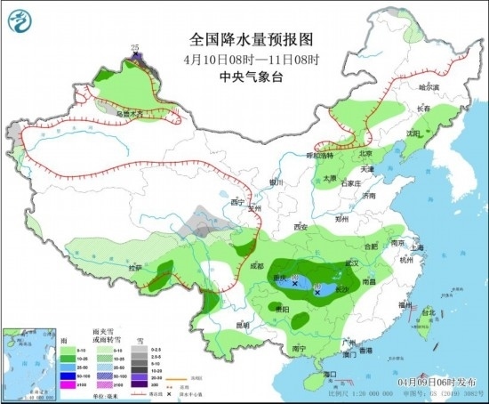 4月9日08時至10日08時,內(nèi)蒙古東北部、黑龍江西北部、新疆北疆北部和伊犁河谷、西藏北部和西部、青海中部和北部、川西高原北部等地部分地區(qū)有小到中雪或雨夾雪,其中,新疆北疆北部等地局部有大到暴雪(10~18毫米)。新疆北部、內(nèi)蒙古中部、華北北部、西藏中部和東南部、青海東部、甘肅中部和南部、寧夏、陜西北部和西南部、四川盆地大部、重慶、湖北西部、貴州北部、湖南北部、云南西部和東南部、廣西東南部、海南島、臺灣島等地部分地區(qū)有小到中雨,其中,西藏東南部局地有大雨(25~30毫米)。新疆北疆沿天山地區(qū)、甘肅西部、內(nèi)蒙古西北部、黑龍江東北部、西藏中部等地部分地區(qū)有4~6級風。東海大部海域、臺灣海峽、臺灣以東洋面、巴士海峽、南海東北部海域?qū)⒂?~7級、陣風8級的風,其中臺灣海峽的部分海域風力可達8級、陣風9級。