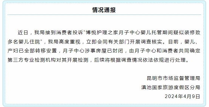 央視網消息:據“滇池度假發(fā)布”官微消息,昆明市市場監(jiān)督管理局滇池國家旅游度假區(qū)分局通報,近日,該局接到消費者投訴“博悅護理之家月子中心嬰兒托管期間疑似裝修致多名嬰兒住院”,該局高度重視,立即會同有關部門開展調查核實。目前,嬰兒、產婦已全部轉移安置,月子中心涉事房屋已封閉,由月子中心和消費者共同確定第三方專業(yè)檢測機構對其開展檢測,后續(xù)將根據調查情況依法依規(guī)進行處理。