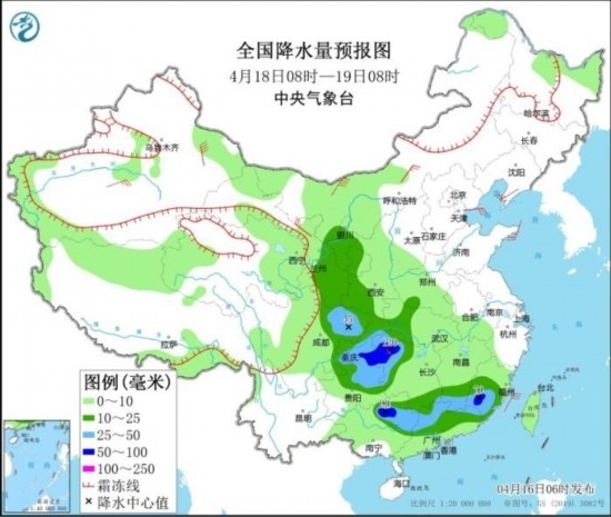 全國降水量預(yù)報(bào)圖(4月18日08時(shí)-19日08時(shí))