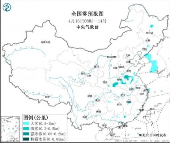 全國霧預(yù)報(bào)圖(4月16日08時(shí)-16日14時(shí))