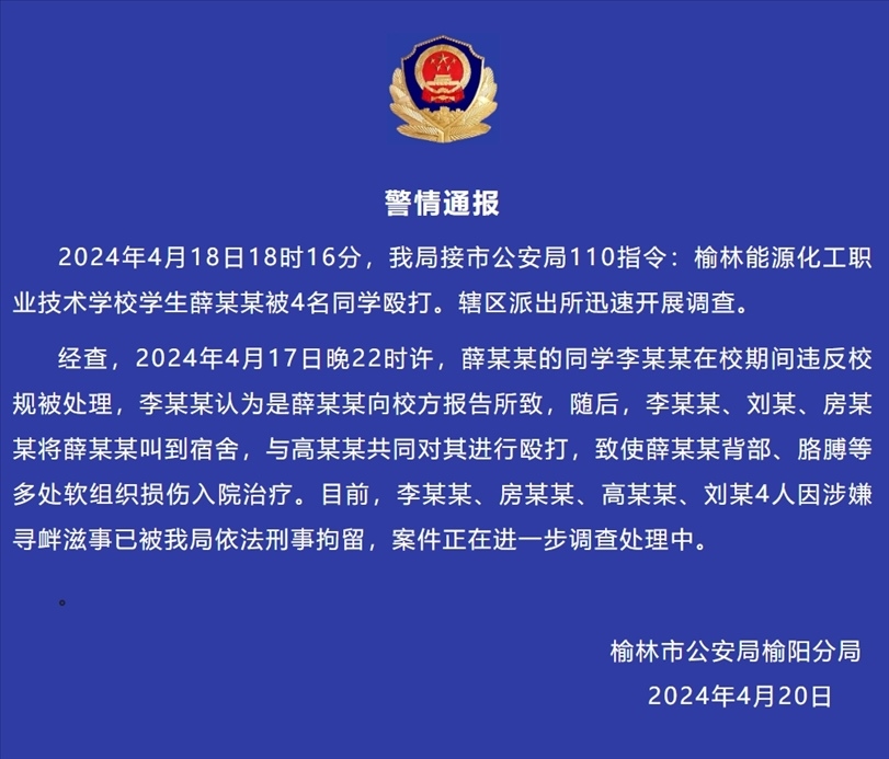 央視網(wǎng)消息:據(jù)陜西榆林公安消息,2024年4月18日18時16分,榆陽公安局接市公安局110指令:榆林能源化工職業(yè)技術(shù)學校學生薛某某被4名同學毆打。轄區(qū)派出所迅速開展調(diào)查。