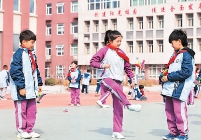 河北省邢臺(tái)市廣宗縣第四小學(xué)學(xué)生在課間踢毽子。王 壘攝(人民視覺(jué))
