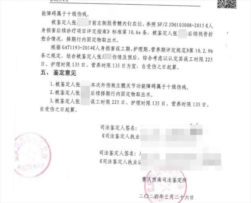 張同學(xué)介紹,第一次開庭主要是確定鑒定機(jī)構(gòu)。張同學(xué)提供的司法鑒定書顯示,2024年3月26日,重慶西南司法鑒定所鑒定認(rèn)為,她本次外傷致左髖關(guān)節(jié)功能十級(jí)傷殘。其左側(cè)股骨髓內(nèi)釘在位,后續(xù)視骨折愈合情況,擇期行內(nèi)固定物取出術(shù)。
