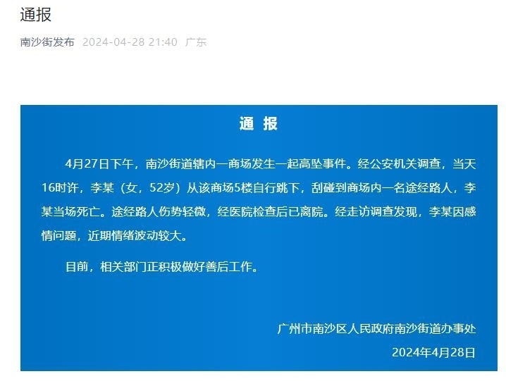 央視網(wǎng)消息:廣州南沙街道4月28日晚通報(bào),4月27日下午,南沙街道轄內(nèi)一商場(chǎng)發(fā)生一起高墜事件。經(jīng)公安機(jī)關(guān)調(diào)查,當(dāng)天16時(shí)許,李某(女,52歲)從該商場(chǎng)5樓自行跳下,刮碰到商場(chǎng)內(nèi)一名途經(jīng)路人,李某當(dāng)場(chǎng)死亡。途經(jīng)路人傷勢(shì)輕微,經(jīng)醫(yī)院檢查后已離院。經(jīng)走訪調(diào)查發(fā)現(xiàn),李某因感情問(wèn)題,近期情緒波動(dòng)較大。目前,相關(guān)部門(mén)正積極做好善后工作。