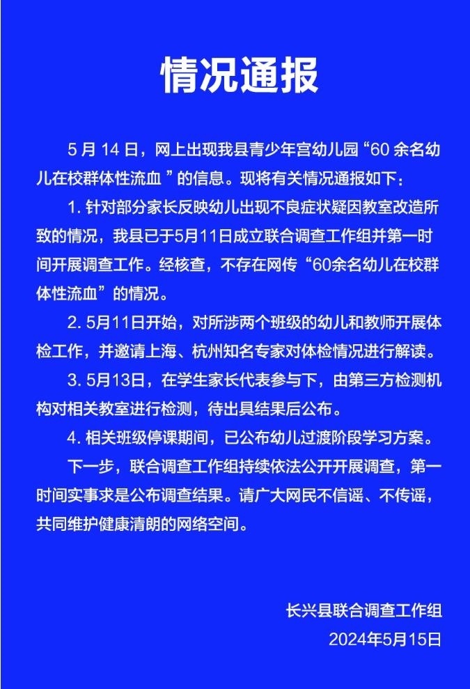 1.針對部分家長反映幼兒出現(xiàn)不良癥狀疑因教室改造所致的情況,我縣已于5月11日成立聯(lián)合調(diào)查工作組并第一時間開展調(diào)查工作。經(jīng)核查,不存在網(wǎng)傳“60余名幼兒在校群體性流血”的情況。