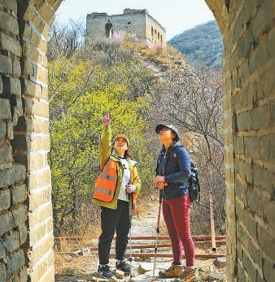 劉紅巖(左)在給游人講解長城保護(hù)相關(guān)知識。受訪者供圖