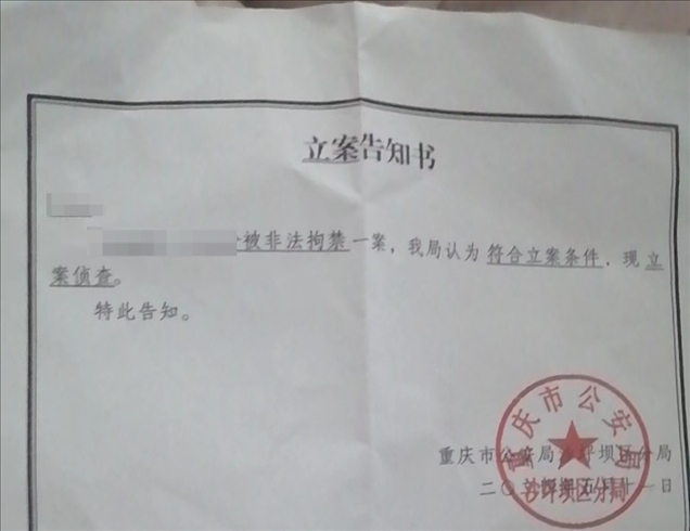事發(fā)后,家屬向當(dāng)?shù)嘏沙鏊鶊?bào)案。王先生出示的立案告知書顯示,5月11日,重慶市公安局沙坪壩區(qū)分局對(duì)前文中的夫妻倆被非法拘禁一案立案?jìng)刹椤?/p>