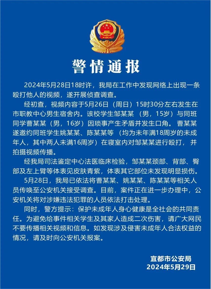 同時,警方提示:保護未成年人身心健康是全社會的共同責(zé)任。為避免給事件相關(guān)學(xué)生及其家人造成二次傷害,請廣大網(wǎng)民不要傳播相關(guān)視頻和信息。如發(fā)現(xiàn)涉及侵害未成年人合法權(quán)益的情況,請及時向公安機關(guān)報案。