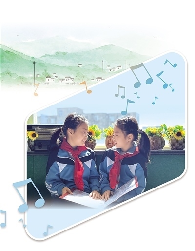 講臺(tái)上,隨著廖光新的雙手向前一打開,學(xué)生們齊刷刷地唱了起來?!敖裉焯鞖夂茫フ腋赂拢ㄍ馄牛﹪D……”稚嫩而清脆的聲音瞬間充滿整個(gè)教室,透過窗戶傳向遠(yuǎn)處的大山。