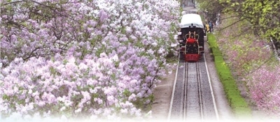 哈爾濱市兒童公園小火車在丁香花海中穿行。張 樹攝(影像中國(guó))